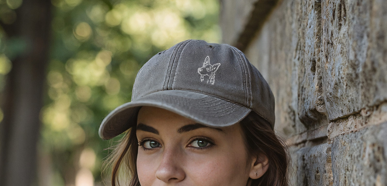 German Shepherd Owner Silhouette Clothing Gifts. 100% Washed Chino Cotton Embroidered 6 Panel Baseball Cap Hat From The House Of Dog.