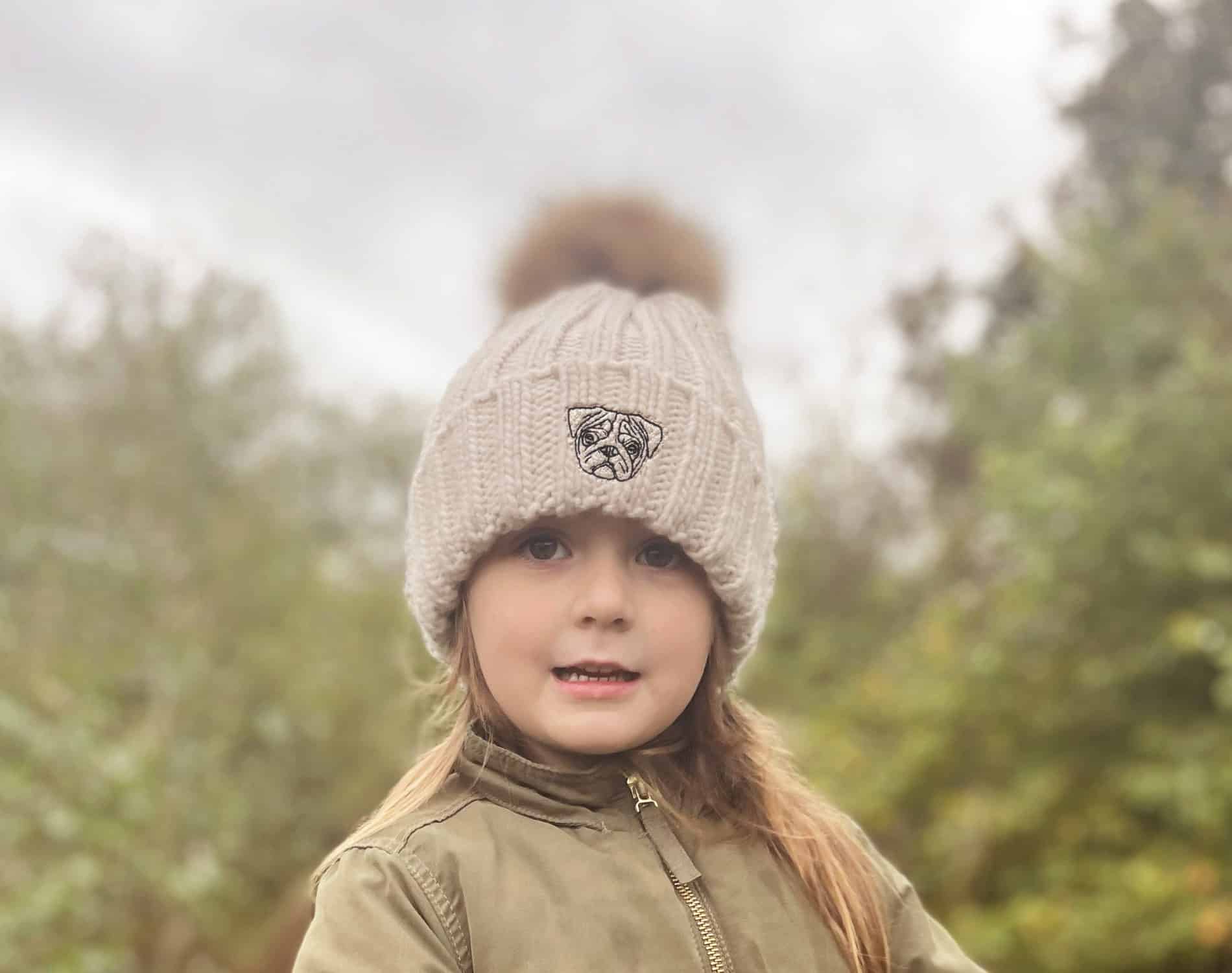 Pug Owner Clothing Gifts, Faux Fur Pom Pom Chunky Knit Super Soft Unisex Embroidered Beanie, From The House Of Dog.
