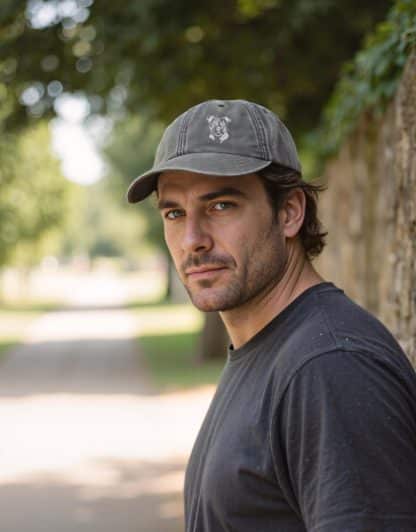 Top quality, low profile, heavyweight distressed vintage washed 100% cotton 6-panel baseball cap, complete with a padded sweatband and metal buckle size adjustment strap. Embroidered with a high quality unique design. Makes a wonderful gift for any Staffy owner.
