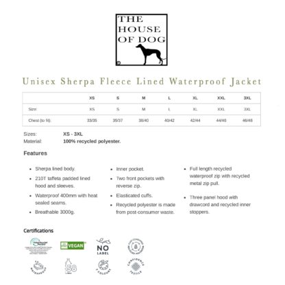 Whippet Clothing Gifts Embroidered Unisex Eco-Friendly Sherpa Fleece Lined Waterproof Jacket From The House Of Dog.